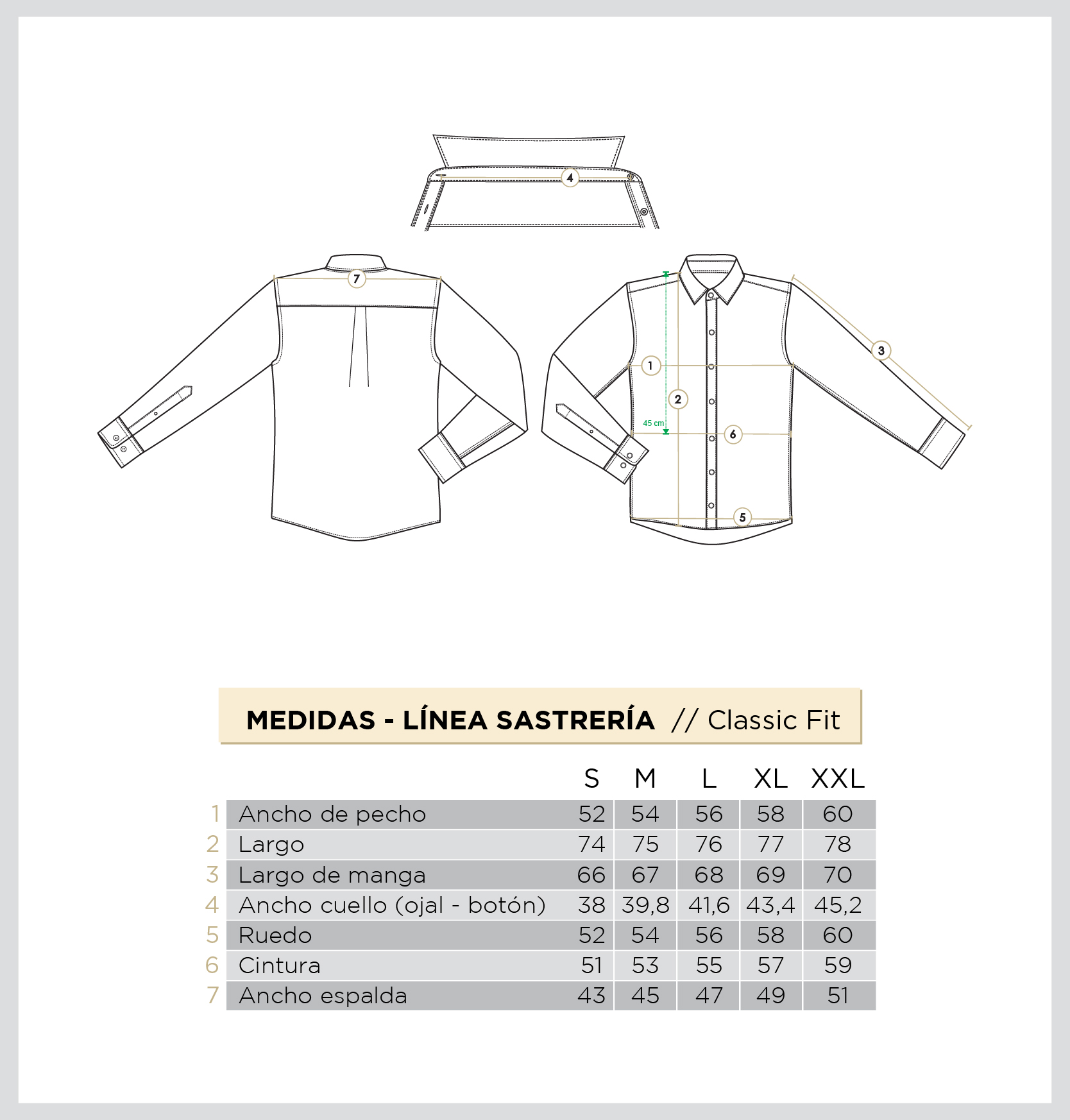 Calce: Classic fitTejido: Ratier 100% Algodón Pima Cuello con balleneroEntretela fusionada de algodón en cuellos y puñosBotones de nácar blancos